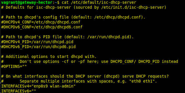 Afegim la configuració de la nostra xarxa al fitxer /etc/default/isc-dhcp-server amb aquesta configuració a la línia, la xarxa lan i la xarxa wlan.