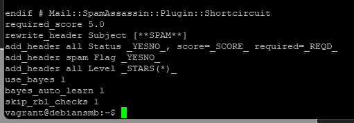 sudo apt install spamassassin spamc amavis clamav clamav-daemon mailutils rsyslog -y Configuració de SpamAssassin al fitxer /etc/spamassassin/local.cf també al final del mateix: