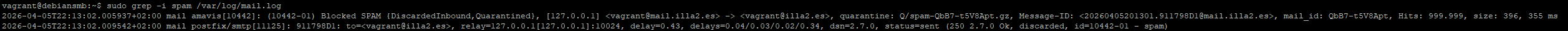 sudo grep -i spam /var/log/mail.log La línia de log que confirma el funcionament correcte del sistema:
