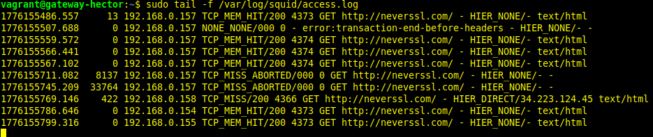 Des del client naveguem normalment cap a qualsevol web HTTP. Al servidor, comprovem els logs en temps real amb la comanda:
