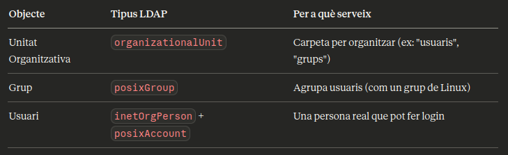 Quan muntes un servidor LDAP, primer crees l’estructura (les branques, l’OU). Ara toca omplir-la amb objectes reals: