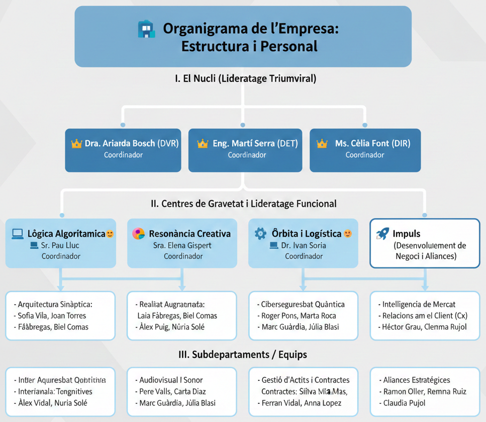 Estructura Híbrida: Adopta un model matricial dinàmic basat en Centres de Gravetat (funció estable) i Cèl·lules d’Innovació (projecte temporal), maximitzant la flexibilitat i minimitzant la burocràcia.