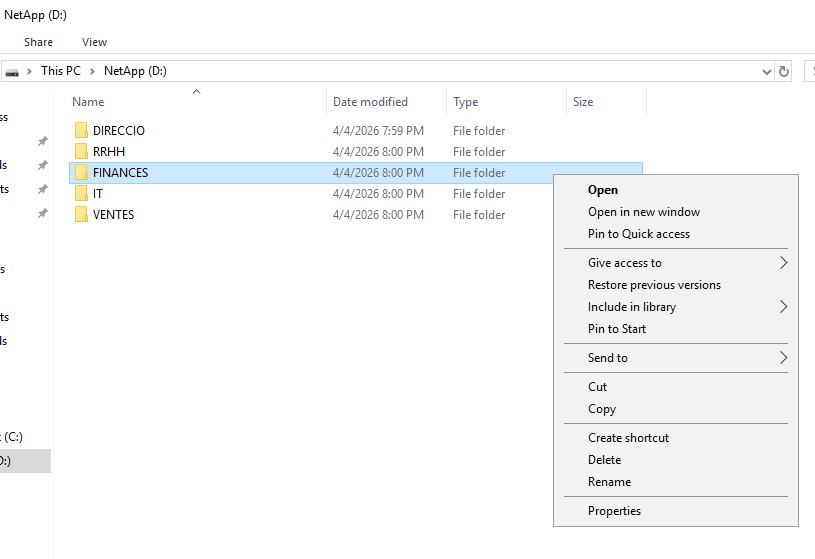 Per a tenir un directori en el qual es pot treballar i accedir desde les màquines clients del AD, primer de tot haurem de tenir un directori o unitat compartida. En el nostre cas farem ús de carpetes per als departaments, on tindrem una unitat secundaria que fem fictícia com si fos una NetApp, podríem haver fet ús d’una màquina virtual també per fer-ho més realista com si tinguéssim una NetApp verdadera, però per falta de temps a les hores del repte no ha pogut ser.