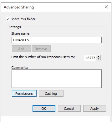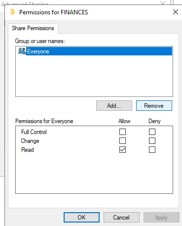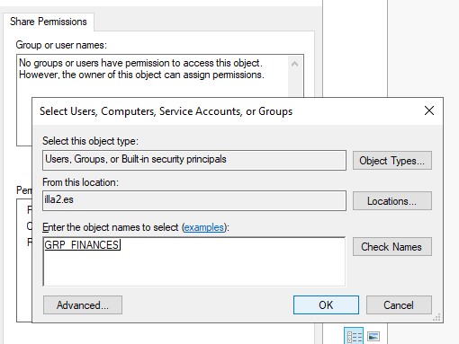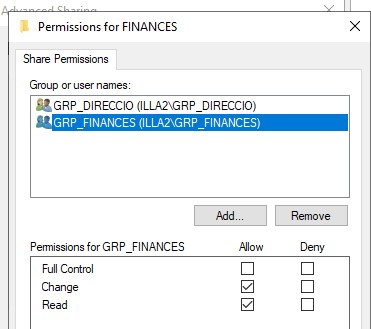 Com es pot observar, es tan senzill com seleccionar el directori a compartir, “advanced settings” -> “Permissions” -> “Remove” per eliminar “Everyone” i afegim el GRP del departament desitjat, en aquest cas “GRP_FINCANCES” on no donem control total, el tindrà només Direcció.