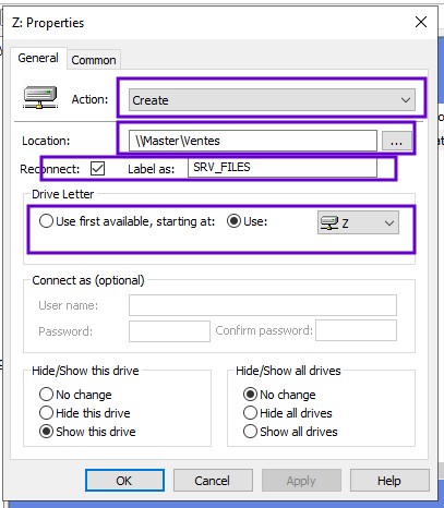 Aquí crearem un “New Mapped Drive”, és a dir, el disc virtual que veuran els usuaris del departament. Quan obrà la finestra seleccionarem al desplegable molt important “Create”, la ruta on esta ubicat en xarxa: “\\Master\Ventes”, seleccionem Reconnect per si de cas perd connexió i afegim una etiqueta que veurà el departament en qüestió en el disc virtual. I per últim i més important la lletra on els hi mostra a l’explorador de fitxers, en aquest cas la lletra Z:
