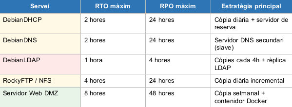 - RTO (Recovery Time Objective): temps màxim tolerable per recuperar el servei.