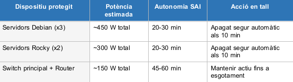Es recomana la instal·lació del programari NUT (Network UPS Tools) en tots els servidors per monitorar l’estat del SAI i automatitzar l’apagada segura quan la bateria arribi al 20% de càrrega.