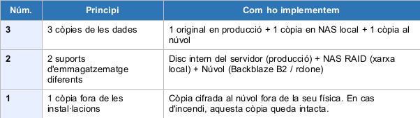 S’implementen tres tipus de còpies complementàries per a cada servidor crític: