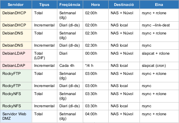 Còpia incremental: cada nit (de dilluns a dissabte) a les 02:00h. Desa únicament els fitxers nous o modificats des de l’última còpia (total o incremental anterior). Ocupa poc espai però requereix totes les peces per restaurar.